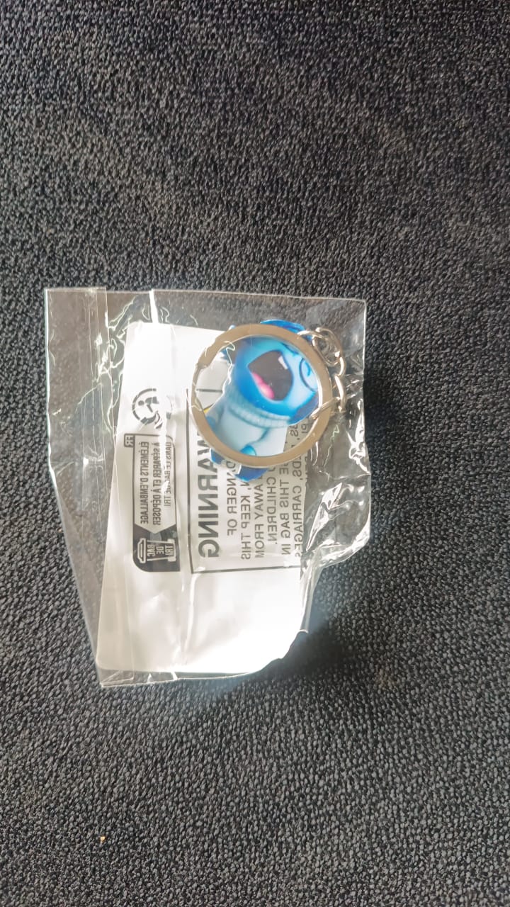 This keychain features a fun cartoon-style character in a vibrant blue outfit with glasses, made from soft PVC material. It is attached to a durable metal key ring and chain. Perfect for kids and fans of animated characters, it can be used as a key holder, bag charm, zipper accessory, or stationery add-on. Comes packed in a clear poly bag.
